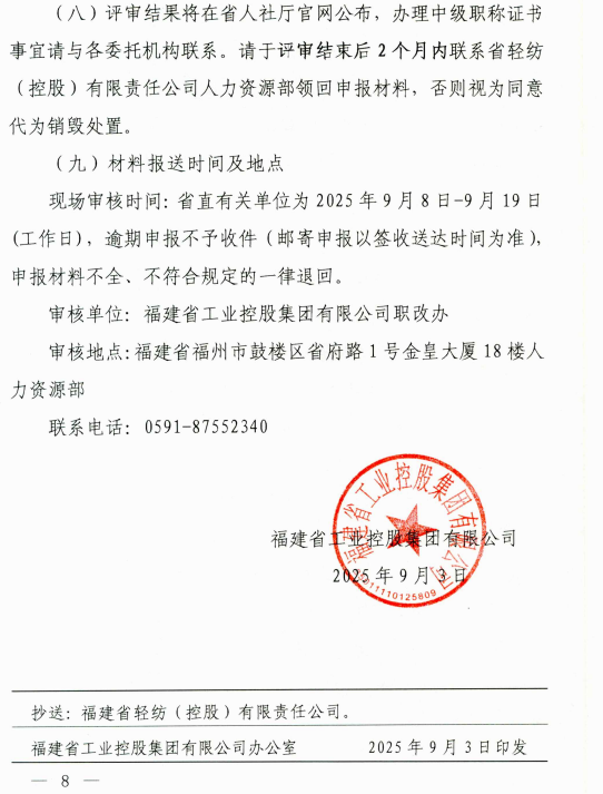 福建省工業(yè)控股集團有限公司關(guān)于開展 福建省輕紡專業(yè)中級工程師職稱 評審工作的通知