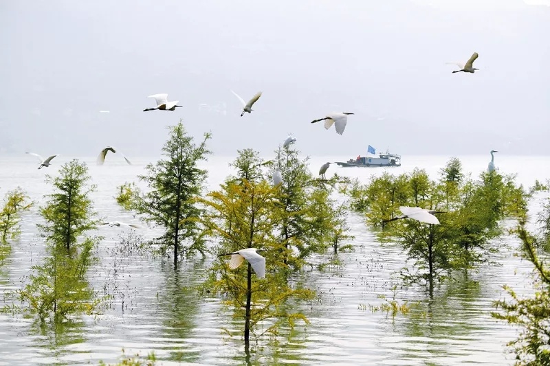 人民法院認(rèn)真貫徹落實(shí)習(xí)近平生態(tài)文明思想,努力為生態(tài)文明建設(shè)與綠色發(fā)展提供優(yōu)質(zhì)司法服務(wù)。在長(zhǎng)江三峽庫(kù)區(qū),為解決庫(kù)區(qū)消落帶植物存活的治理難題,重慶法院引進(jìn)了耐淹耐旱的中山杉。圖為重慶法院長(zhǎng)江三峽庫(kù)區(qū)生態(tài)修復(fù)司法保護(hù)示范林的中山杉在水庫(kù)蓄水時(shí)被部分淹沒(méi)的景象。最高人民法院供圖