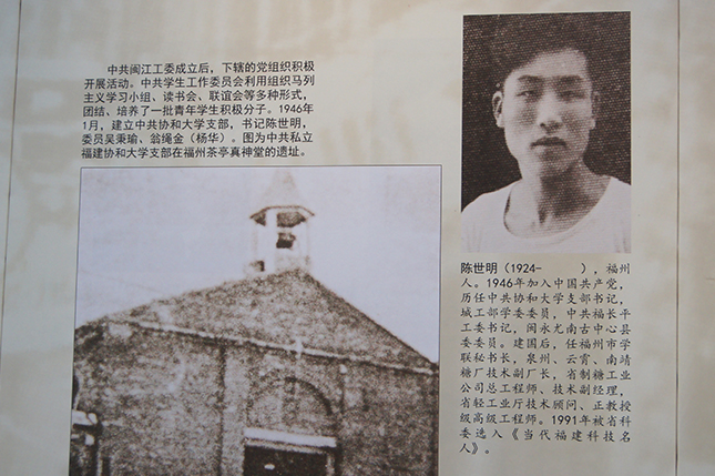 陳世明,男,1924年2月出生在福州一個貧苦工人家庭,中共地下組織的活動開啟了他的進步思想。在美籍建筑師范啟明的資助下,品學(xué)兼優(yōu)的他從協(xié)和大學(xué)畢業(yè)。陳世明的母親和恩人范啟明以及他身邊的很多人都是基督教徒,有不少人勸他信教,他都斷然拒絕。1946年2月,經(jīng)何友禮、何友于兩人介紹,陳世明加入了中國共產(chǎn)黨。入黨后的陳世明走上了充滿艱辛的革命道路,他積極宣傳革命思想,組織開展游擊戰(zhàn)。先后擔任福建省閩江工委學(xué)委,城工部福(清)長(樂)平(潭)工委書記,閩(清)永(泰)尤(溪)、南(平)沙(縣)中心縣委委員,是我省地下黨城工部龍山會議主要參與者之一。1948年3月,一名土匪混入革命隊伍后叛變,正在開會的陳世明等7人不幸被敵人包圍并被逮捕,獄中的陳世明沒有出賣組織和同志。1949年4月1日,重啟國共和談,根據(jù)國共達成“釋放政治犯”的協(xié)議,陳世明于1949年4月30日與同被關(guān)押的20位難友重見天日。