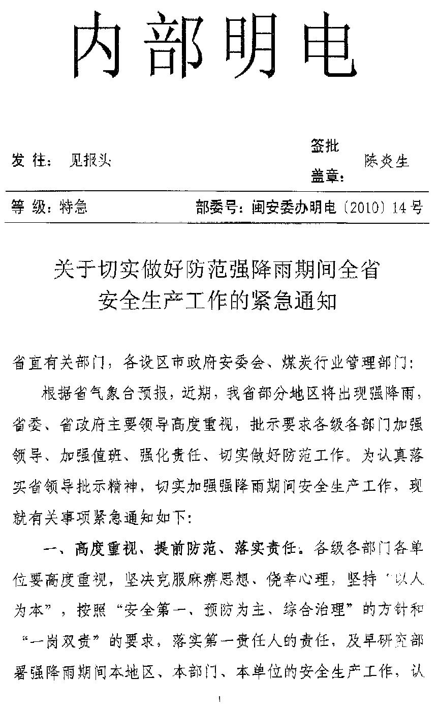 現(xiàn)將《福建省人民政府安全生產(chǎn)委員會(huì)關(guān)于切實(shí)做好防范強(qiáng)降雨期間全省安全生產(chǎn)工作的緊急通知》(閩安委辦明電[2010]14號(hào))轉(zhuǎn)發(fā)給你們。各企業(yè)要從思想上高度重視,認(rèn)真貫徹落實(shí)《通知》要求,加強(qiáng)領(lǐng)導(dǎo),強(qiáng)化責(zé)任制落實(shí),做好值班安排,加強(qiáng)巡查,及時(shí)排查和整改隱患,切實(shí)采取有效防范措施,做好強(qiáng)降雨期間的安全生產(chǎn)工作。