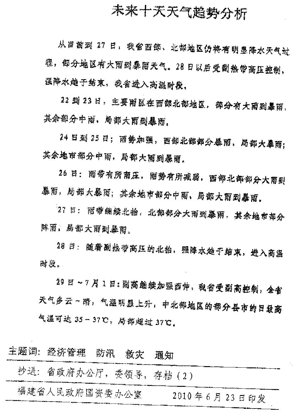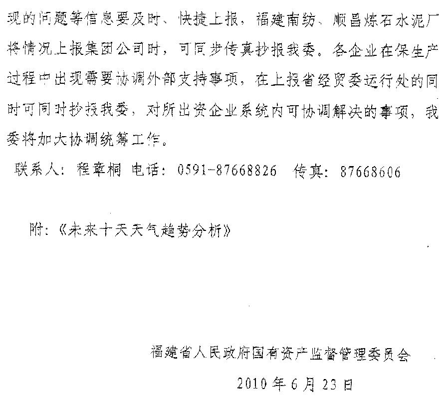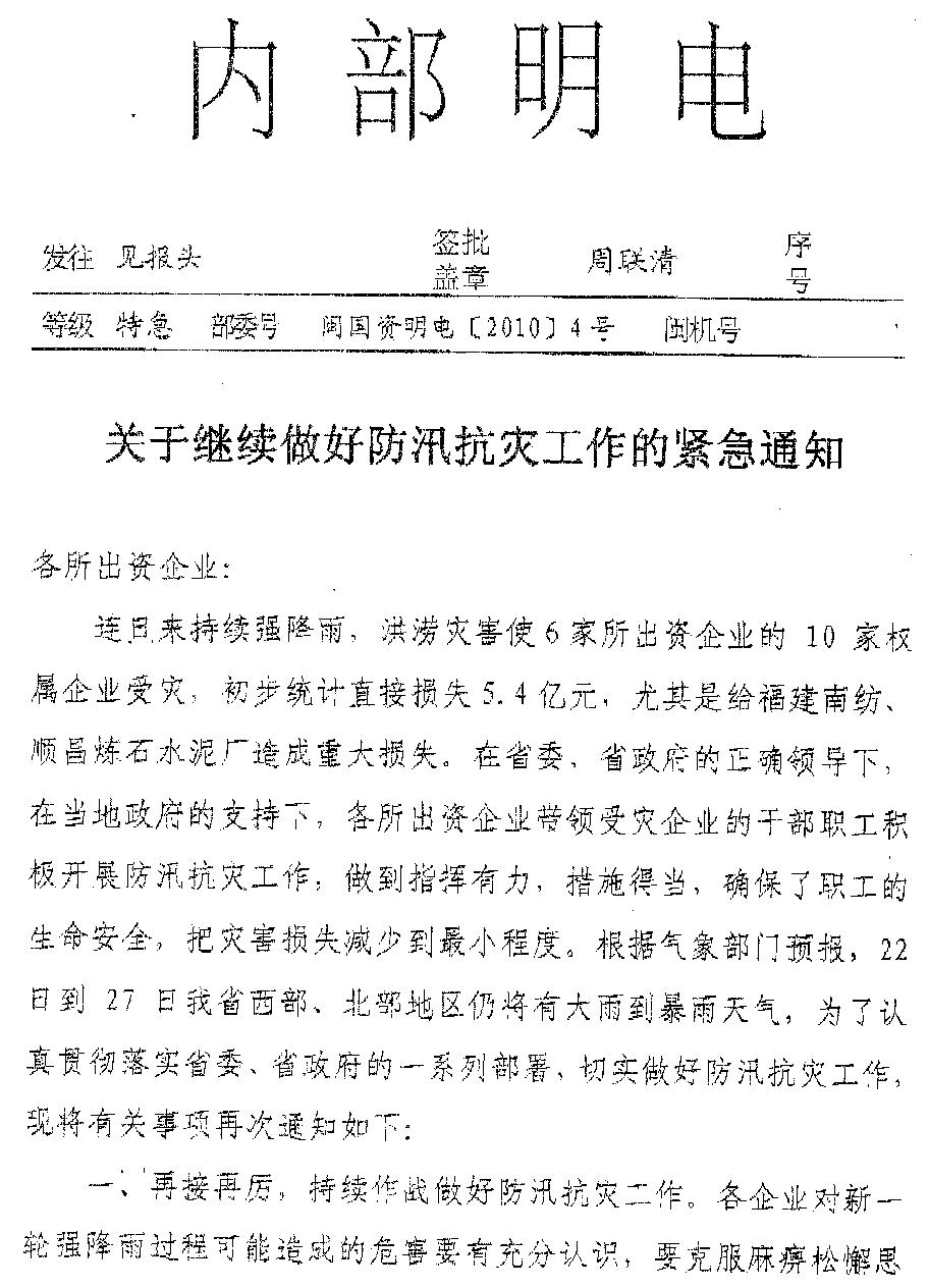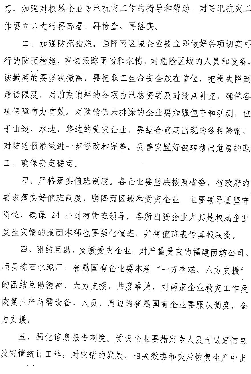 現(xiàn)將福建省人民政府國有資產(chǎn)監(jiān)督管理委員會《關(guān)于繼續(xù)做好汛期抗災工作的緊急通知》(閩國資明電〔2010〕4號)轉(zhuǎn)發(fā)給你們。各企業(yè)要認真貫徹《通知》精神,堅決貫徹省委、省政府關(guān)于防汛救災的一系列部署,克服僥幸、麻痹、松懈思想,克服厭倦、畏難情緒,加大巡查力度,針對有可能發(fā)生的地質(zhì)災害,要采取果斷措施,把職工群眾生命安全放在第一位,及時轉(zhuǎn)移人員和財產(chǎn),確保人員安全和財產(chǎn)損失降低到最低程度。