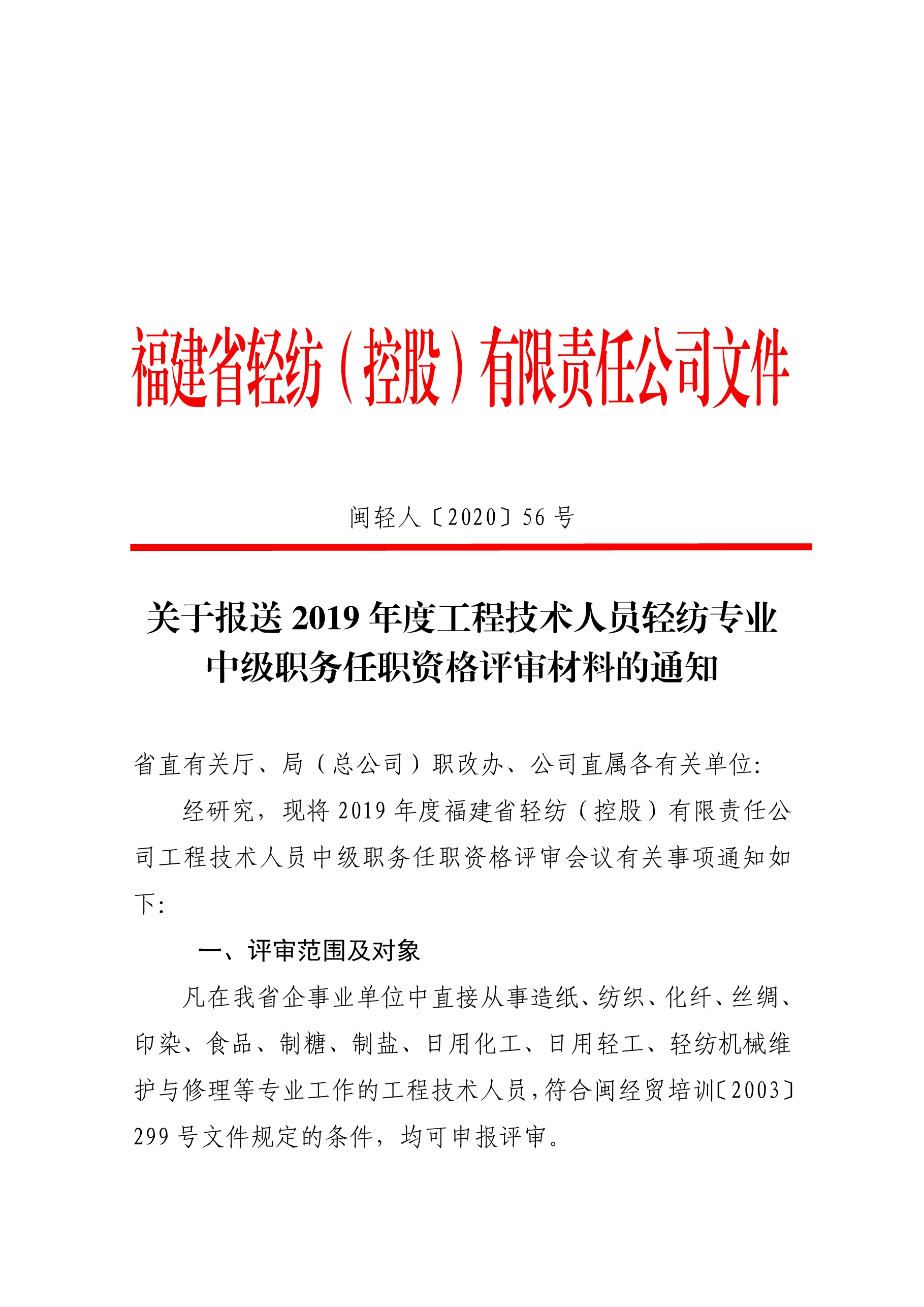 關(guān)于報送 2019 年度工程技術(shù)人員輕紡專業(yè)中級職務(wù)任職資格評審材料的通知