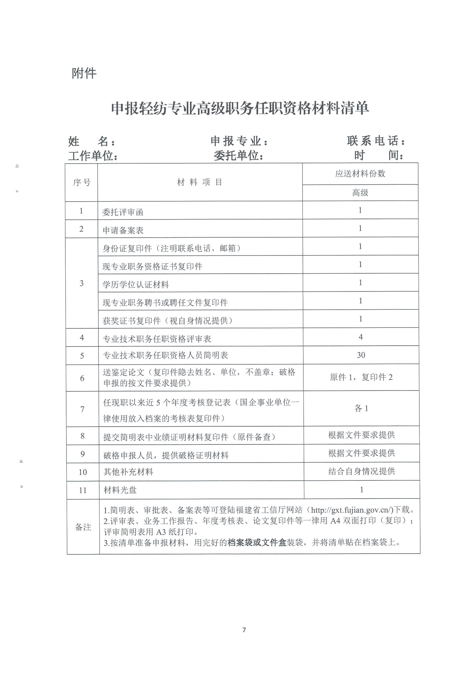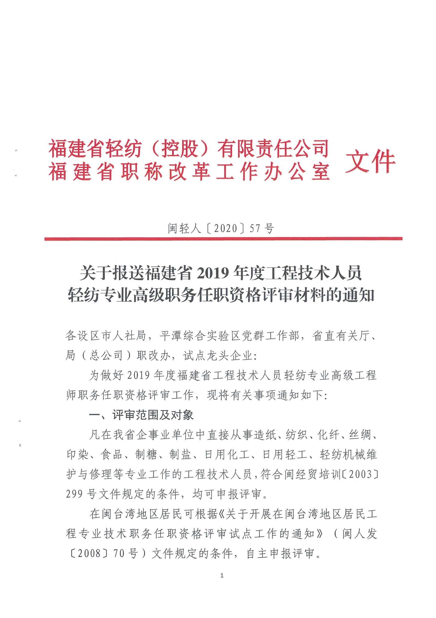 關(guān)于報(bào)送2019年度工程技術(shù)人員輕紡專業(yè)高級(jí)職務(wù)任職資格評(píng)審材料的通知