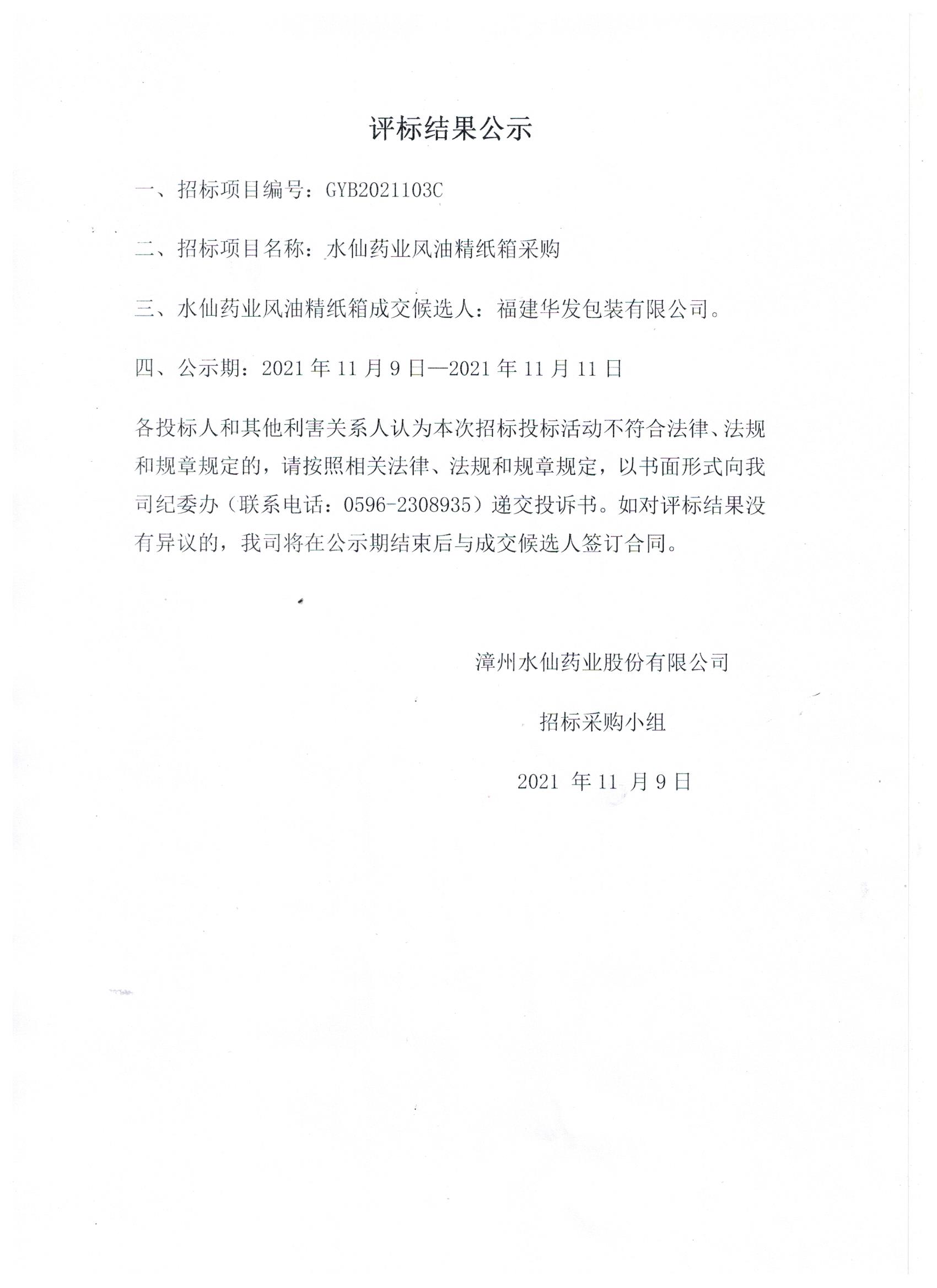 水仙藥業(yè)風(fēng)油精紙箱評標(biāo)結(jié)果公示