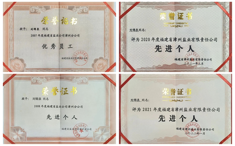 劉錦泉在工作崗位獲得的榮譽證書